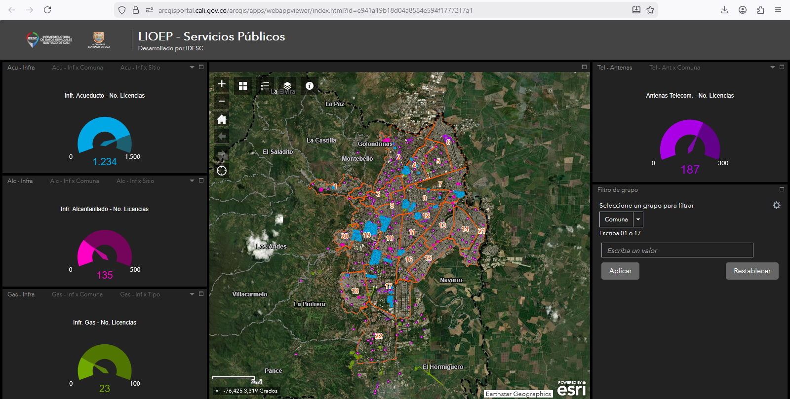 El mapa interactivo de Licencias de Intervención y Ocupación del Espacio Público (LIOEP) es una aplicación web geográfica puesta a disposición por la Alcaldía de Santiago de Cali, a través de su ecosistema geoespacial, que permite consultar de manera integrada las licencias otorgadas para la ejecución de obras de servicios públicos en el espacio público del Distrito. El visor muestra, sobre el mapa de la ciudad, los puntos y trazados donde se desarrollan intervenciones asociadas a acueducto, alcantarillado, energía, gas y telecomunicaciones, organizadas por tipo de infraestructura y red. La aplicación incorpora herramientas de navegación, activación de capas por servicio, filtros territoriales (como comuna) y estadísticas dinámicas que facilitan la identificación de tendencias y la consulta rápida de la información, evitando la revisión de múltiples documentos. El visor se actualiza periódicamente para reflejar las licencias vigentes, las cuales tienen una duración de hasta veinticuatro (24) meses desde su otorgamiento. La información fue estructurada por el equipo del Sistema de Información Geográfica con el apoyo de la IDESC, a partir de datos suministrados por la Subdirección de Espacio Público y Ordenamiento Urbanístico.
