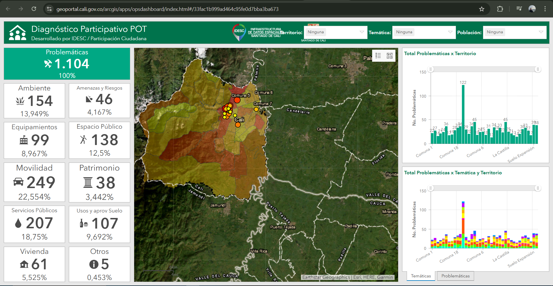 El nuevo mapa interactivo Diagnóstico Participativo POT es una herramienta desarrollada por el equipo técnico de Participación Ciudadana de la Subdirección de Planificación del Territorio, en articulación con la Infraestructura de Datos Espaciales de Santiago de Cali (IDESC). Esta aplicación surge en el marco del proceso de revisión y ajuste del Plan de Ordenamiento Territorial de Santiago de Cali, y constituye un avance significativo en la integración de la ciudadanía en la construcción del modelo de ciudad. El tablero se basa en un nuevo grupo temático del catálogo de objetos geográficos de Planeación, denominado Participación Ciudadana, que permite capturar, visualizar y analizar los aportes realizados por las comunidades durante las jornadas de socialización y diagnóstico participativo del POT. A la fecha, se han registrado 1.104 problemáticas georreferenciadas en comunas, corregimientos y sectores, clasificadas en diez temáticas clave: ambiente, amenazas y riesgos, equipamientos, espacio público, movilidad, patrimonio, servicios públicos, usos y aprovechamiento del suelo, vivienda y otros. La herramienta también integra gráficos explicativos, infografías y un visor fotográfico que muestra imágenes tomadas durante cada jornada participativa, fortaleciendo la trazabilidad y la transparencia del proceso. Además, la aplicación permite filtrar la información por territorio, temática o población, lo que facilita el análisis con enfoque diferencial. De esta manera, se obtiene una lectura precisa de los desafíos locales y de la distribución territorial de los aportes comunitarios.